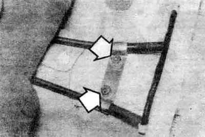 14.8. Для получения доступа к стяжным болтам троса (показаны стрелками) снимите подушку заднего сидения и сдвиньте коврик; если вы заменяете только один трос, должен быть отвинчен только один винт (показана модель Precis)