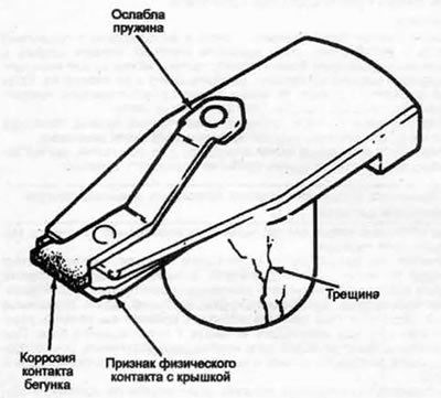 28.11b. Наиболее частые дефекты крышки распределителя (если есть сомнения, установите новую крышку).