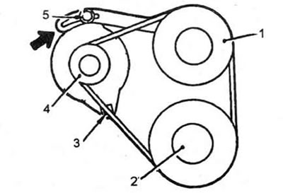 2. Количество приводных ремней, используемых на конкретном автомобиле, зависит от установленного вспомогательного оборудования. Один ремень передает вращение от коленвала к генератору и водяному насосу. Компрессор кондиционера воздуха и насосы усилителя рулевого управления приводятся в действие своими ремнями.