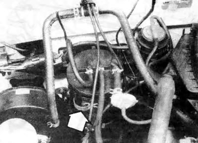 36.2. Бачок системы контроля за выбросом токсичных веществ в атмосферу (угольный) обычно расположен на поперечной перегородке - проверьте целостность шлангов - для снятия бачка отсоедините шланги и пружинные хомуты (стрелка)