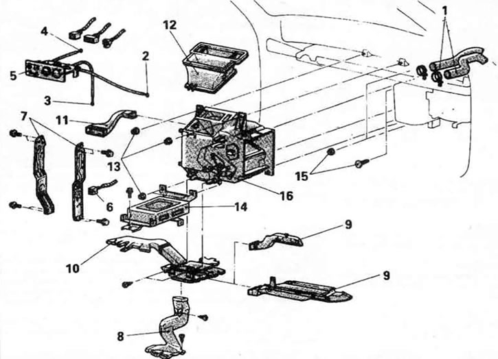 11.5. Типичные детали обогревателя. 1. Шланги нагревателя, 2. Трос управления потоком воздуха, 3. Трос управления температурой, 4. Трос управления режимом работы, 5. Блок управления обогревателем, 6. Электрический разъем, 7. Центральная опора приборной панели, 8. Воздуховод А заднего обогревателя, 9. Воздуховод, 10. Воздуховод, 11. Воздуховод, 12. Центральный вентиляционный воздуховод, 13. Гайки крепления обогревателя, 14. Блок управления, 15. Крепления испарителя, 16. Обогреватель