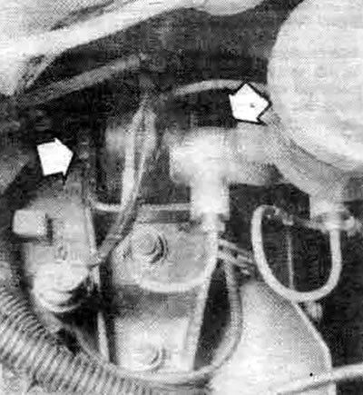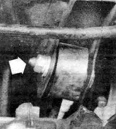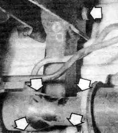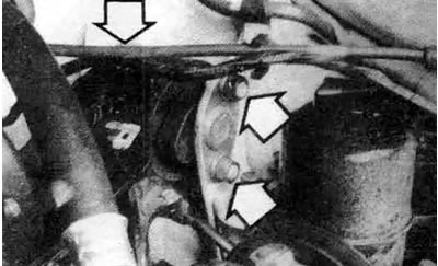 17.8с. Опора коробки передач на некоторых моделях прикреплена к коробке сквозным болтом и гайкой (стрелки) - она прикреплена к корпусу тремя болтами, доступ к которым осуществляется изнутри правого брызговика