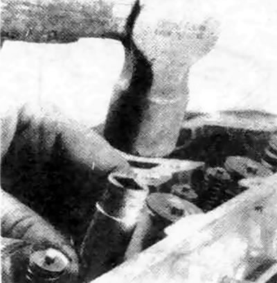 Примечание: Сломанные пружины клапанов и поврежденные маслосъемные колпачки можно заменить без снятия головки цилиндров. Для выполнения этой операции обычно требуются два специальных инструмента и источник сжатого воздуха, поэтому внимательно прочитайте этот раздел и прежде чем начинать работу купите необходимый инструмент. Если сжатый воздух отсутствует то. чтобы не допустить падения клапанов в цилиндры, используйте отрезок нейлонового шнура.