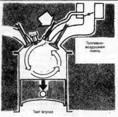 2. Воздух входит через впускное отверстие, расположенное рядом с первой дроссельной заслонкой карбюратора, затем проходит к инжекторному клапану через канал во впускном коллекторе и головке цилиндров, откуда он всасывается через отверстие инжекторного клапана в камеру сгорания.
