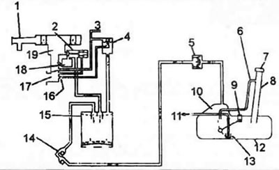 3.2а. Элементы системы контроля за выбросом токсичных веществ в атмосферу для карбюраторных моделей (типовые). 1. Воздушный фильтр, 2. Клапан вентиляции поплавковой камеры. 3. К термоклапану, 4. Клапан продувки, 5. Ограничитель переполнения (двухходовой клапан), 6. Ограничитель переполнения (уровневая трубка), 7. Крышка заливной горловины топливного бака, 8. Заливная труба топливного бака, 9. Датчик уровня топлива, 10. Объем для терморасширения, 11. Топливо (к карбюратору), 12. Топливный бак, 13. Фильтр, 14. Обратный топливный клапан, 15. Бачок, 16. Отверстие, 17. Впускной коллектор, 18. Поплавковая камера карбюратора, 19. Карбюратор.