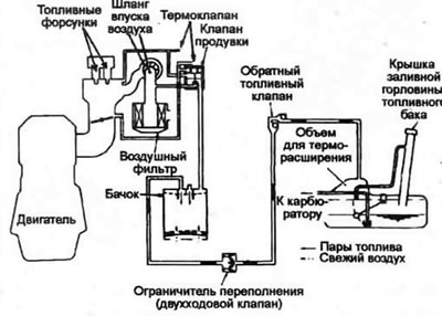 2. Типовая система контроля за выбросом паров топлива в атмосферу состоит из бачка, клапана вентиляции поплавковой камеры, системы продувки, ограничителя перелива, термоклапана, обратного топливного клапана и крышки заливной горловины топливного бака специальной конструкции (см. иллюстрацию).