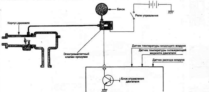 5. Система продувки закрыта при работе двигателя на холостом ходу и предотвращает попадание паров топлива во впускной коллектор На высоких частотах вращения двигателя клапан системы продувки открывается.