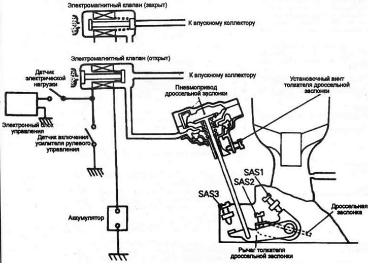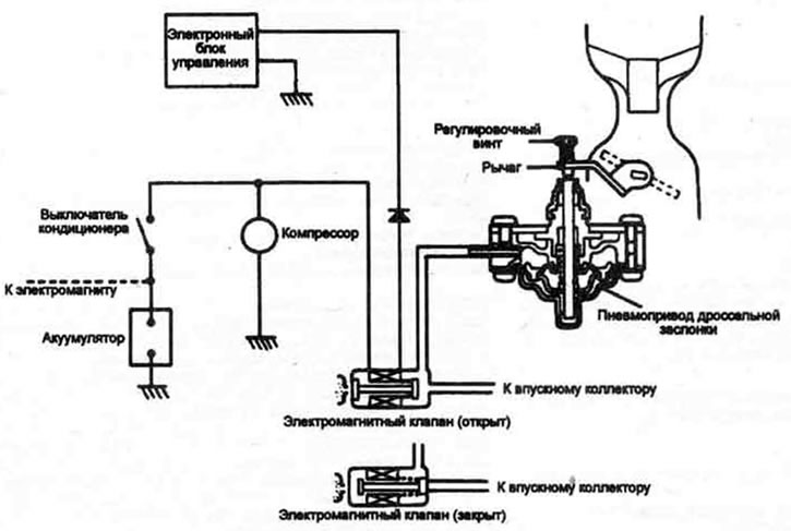 3. Эта система повышения частоты вращения холостого хода состоит из мембранного толкателя дроссельной заслонки, электромагнитного клапана, выключателя кондиционера воздуха и электронного блока управления (ECU) (см. иллюстрацию).