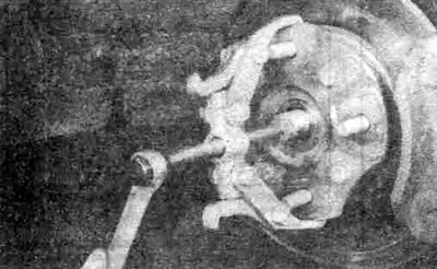 1. Затяните стояночный тормоз, снимите крышку колеса и ослабьте гайку ступицы. Ослабьте гайки крепления передних колес, поднимите автомобиль и установите его на устойчивые подставки. Снимите переднее колесо.