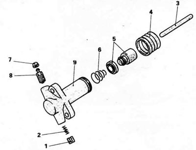 7.7. Подетальный вид рабочего цилиндра сцепления. 1. Пластина клапана, 2. Пружина, 3. Толкатель, 4. Чехол, 5. Поршень и манжета, 6. Коническая пружина, 7. Крышка, 8. Клапан выпуска воздуха, 9. Рабочий цилиндр