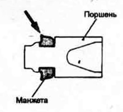 8. Используя новые детали из ремонтного комплекта, соберите цилиндр. применяя в качестве смазки чистую тормозную жидкость. Обратите внимание на ориентацию пружины и манжеты.