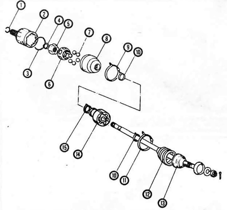 11.5b. Элементы приводного вала шарнира равных угловых скоростей - подетальный вид. 1. Пружинная шайба (всегда заменять), 2. Наружная обойма внутреннего шарнира равных угловых скоростей, 3. Проволочных держатель шариков, 4. Пружинное кольцо, 5. Внутренняя обойма, 6. Сепаратор, 7. Шарики, 8. Внутренний чехол, 9. Хомут чехла, 10. Хомут чехла, 11. Хомут чехла, 12. Наружный чехол, 13. Наружный шарнир равных угловых скоростей в сборе с осью, 14. Динамический демпфер (только левая сторона), 15. Хомут динамического демпфера (только левая сторона)