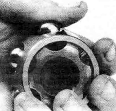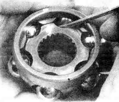38. Разверните корпус шарнира равных угловых скоростей на некоторый угол относительно приводного вала, чтобы были видны шарики, внутренняя обойма и сепаратор. Проверьте степень износа поверхностей шариков и обоймы. Если детали повреждены или изношены, замените приводной вал.