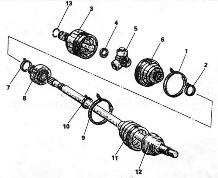11.24. Подетальный вид шарнира с крестовиной в сборе с осью. 1. Хомут, 2. Хомут, 3. Корпус крестовины, 4. Пружинное кольцо, 5. Крестовина, 6. Чехол, 7. Хомут динамического демпфера (только левая сторона), 8. Динамический демпфер (только левая сторона), 9. Хомут чехла, 10. Хомут чехла, 11. Чехол, 12. Наружный шарнир равных угловых скоростей (неразборный), 13. Пружинная шайба