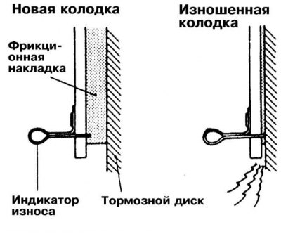 1. Колодки дисковых тормозных механизмов оборудованы индикаторами износа, начинающими издавать высокочастотный звук (визг) при стирании фрикционных накладок ниже 2 мм толщины.