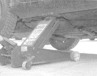 Заведите домкрат под автомобиль: задние домкратные точки расположены с задних краев дверных водостоков, при поддомкрачивании передка домкрат заводится под подрамник.