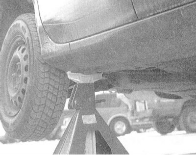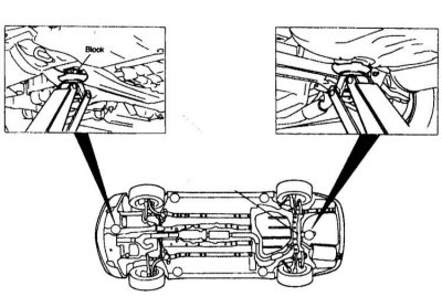 При поддомкрачивании автомобиля с целью фиксации его в поднятом положении при выполнении более серьезных, чем замена колеса, ремонтных работ головку гидравлического домкрата следует заводить под переднюю срединную балку и/или под кронштейн, закрепленный на задней панели пола. С целью распределения нагрузки между головкой домкрата и поверхностью домкратной точки следует прокладывать деревянный блок.