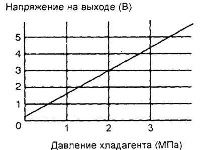 3. Проверьте, что напряжение сигнала датчика в зависимости от давления хладагента между выводом "2" датчика и "массой" изменяется так, как показано на графике.