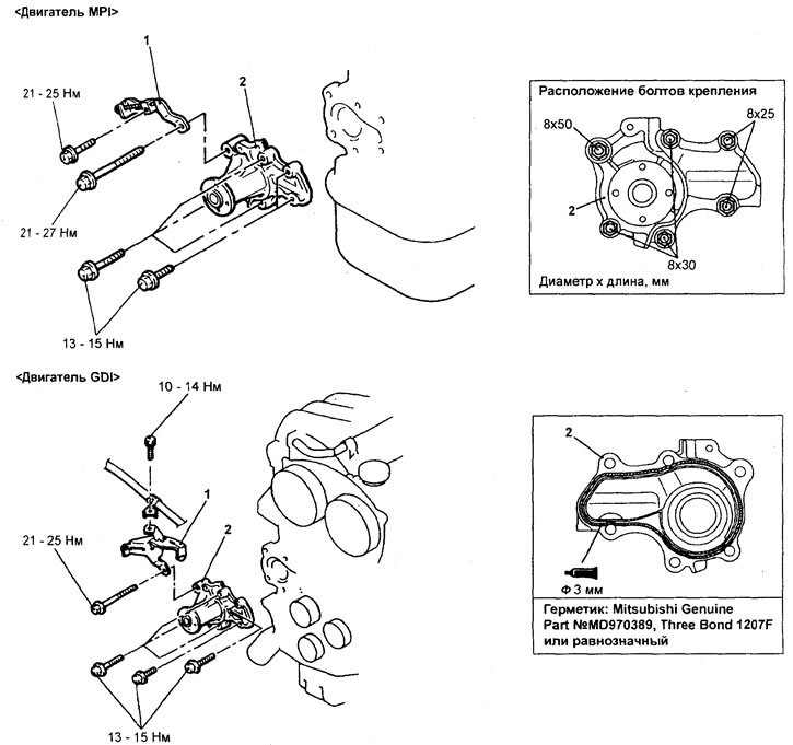 Снятие насоса охлаждающей жидкости (двигатель 4G93-GDI). 1 - болт кре пленил задней крышки ремня привода ГРМ, 2 - насос охлаждающей жидкости