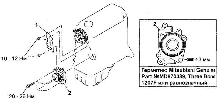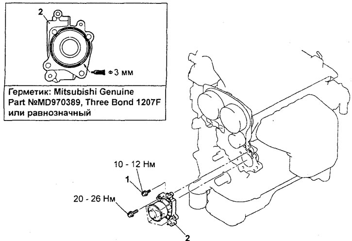 Снятие насоса охлаждающей жидкости (двигатель 4G93-MPI). 1 - задня: левая крышка ремня привода ГРМ, 2 - насос охлаждающей жидкости.