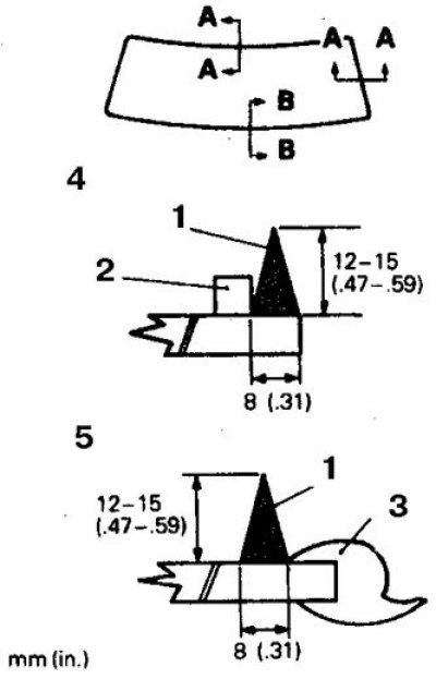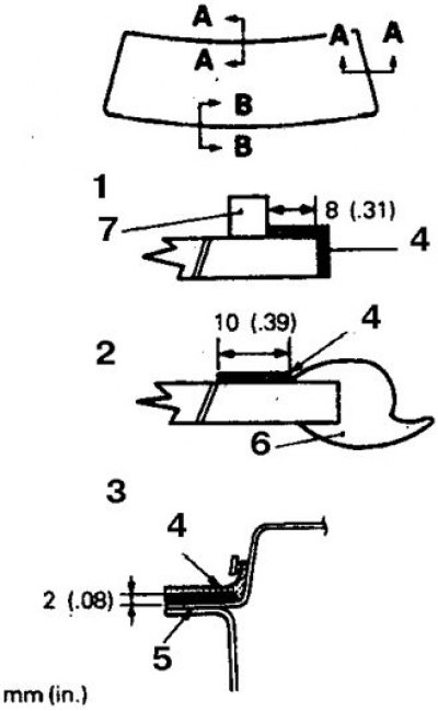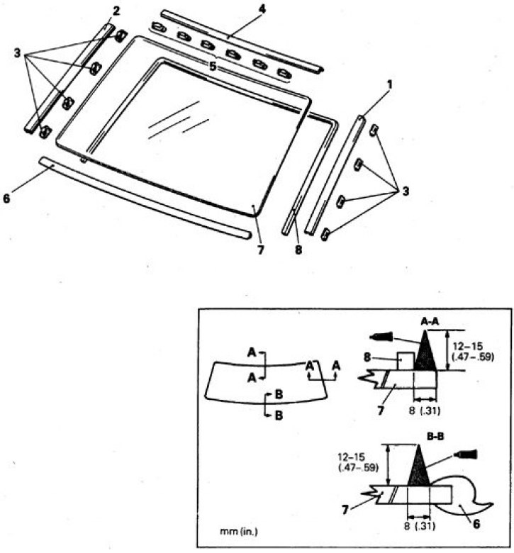 1. Сечение по А–А; 2. Сечение по В–В; 3. Со стороны кузова; 4. Наполнитель; 5. Старый клей; 6. Нижняя накладка стекла; 7. Полоска уплотнителя