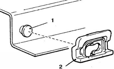 7. Сломанные защелки замените (1 – головка, 2 – защелка крепления ветрового стекла)