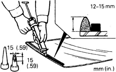 1. Нанесите клей слоем толщиной 12–15 мм (на вставке показана форма среза подающего сопла шприца, которая должна быть Vобразной).