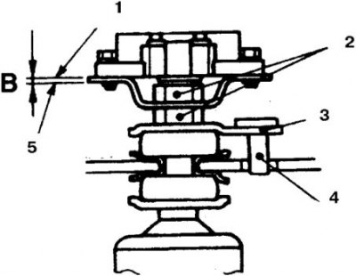 1. Поверхность привода; 2. Гайка; 3. Шайба; 4. Шпилька; 5. Торец шпильки амортизатора; Размер В = 1,5–2,5 мм