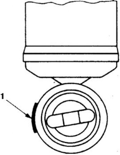 6. Сориентируйте амортизатор так, чтобы маркировка белого цвета (1) была обращена в сторону от автомобиля. На автомобилях 199298 гг. затяните гайку болта с моментом 88–103 Н·м., на остальных автомобилях подтяните болты нижнего крепления с моментом 9–14 Н·м.