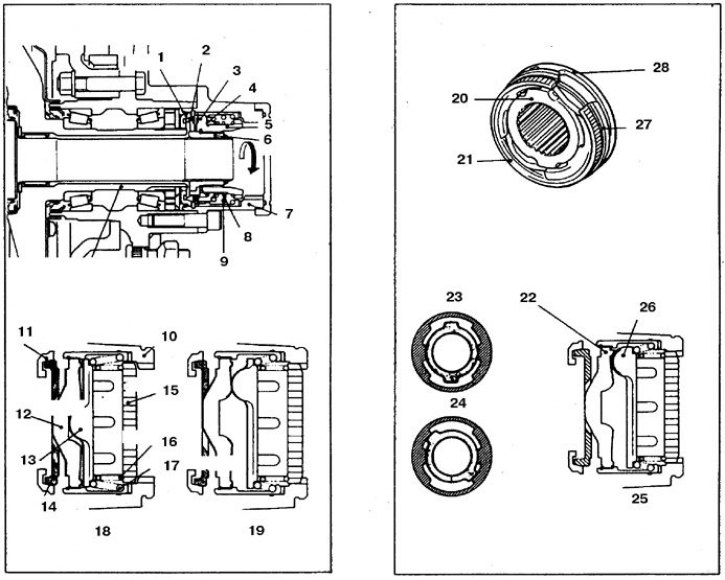 1, 11. Тормоз В; 2, 14, 21. Тормоз А; 3, 12,27. Упорное кольцо А; 4, 13, 26, 28. Кулачок; 5, 15. Передвижная шестерня; 6, 20. Ведущая шестерня; 7, 10. Корпус; 8, 16. Сдвиговая пружина; 9, 17. Возвратная пружина; 18, 23. Колесо разблокировано; 19, 24. Заблокировано; 22. Язычок упорного кольца А; 25. Кулачок в зацеплении с язычком упорного кольца