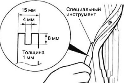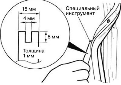 1) Установить специальный инструмент, так как показано на рисунке, и снять внешнюю водонепроницаемую накладку двери с панели двери.