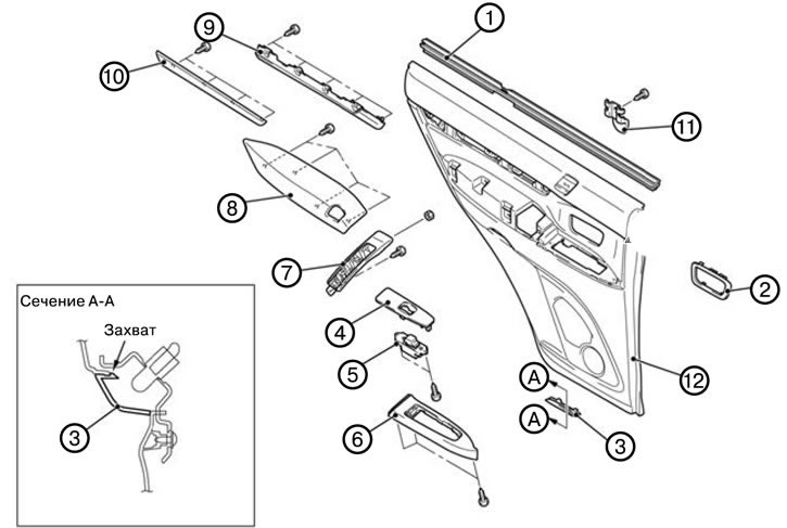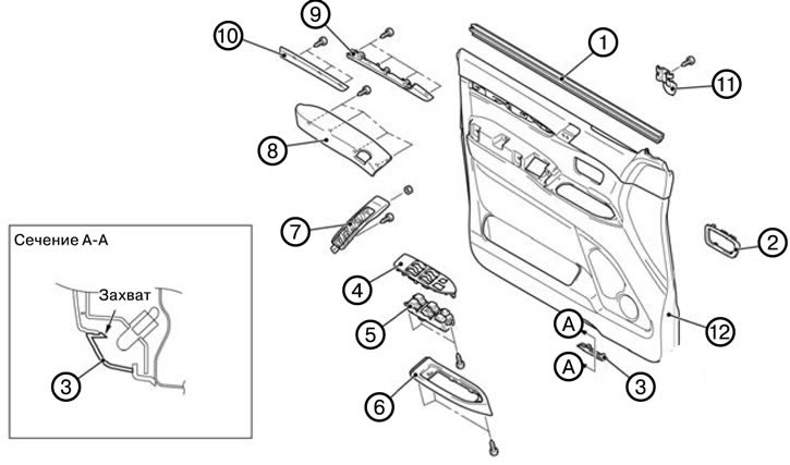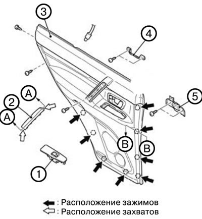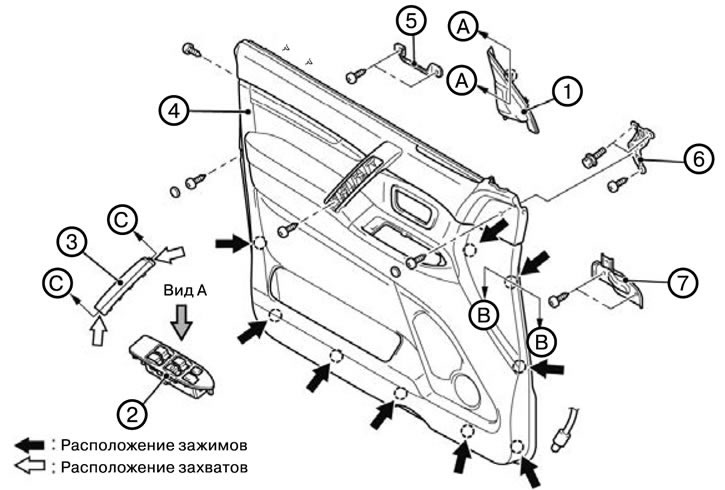 Оглавление: Снятие облицовки двери ⤓ Установка облицовки двери ⤓ Разборка облицовки двери ⤓ Сборка облицовки двери ⤓