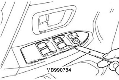 1) Снять панель выключателя электрических стеклоподъемников в сборе при помощи специального инструмента МВ990784.