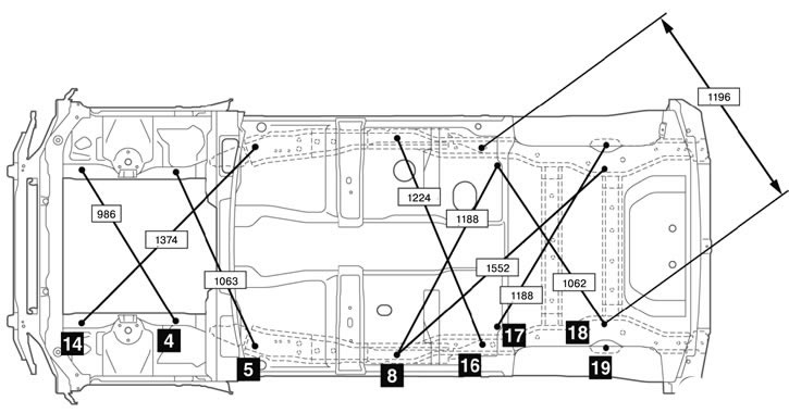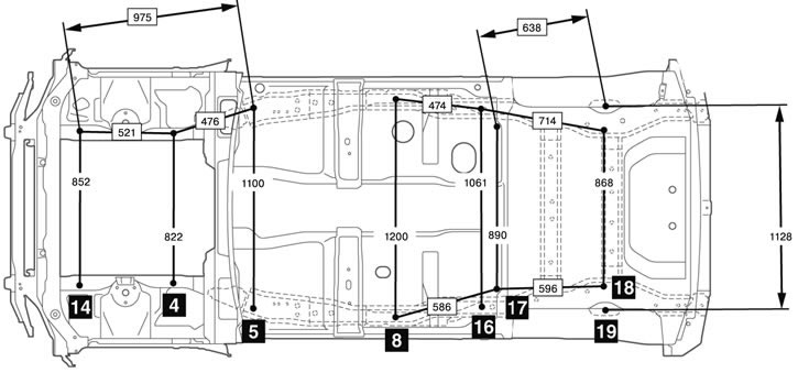 | 8 | Центр установочного отверстия заднего лонжерона | Круглое | 12 |