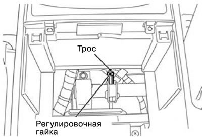 3. Снять держатель стаканов напольной консоли, ослабить затяжку регулировочной гайки до конца тяги троса, чтобы освободить трос, и затем отрегулировать.