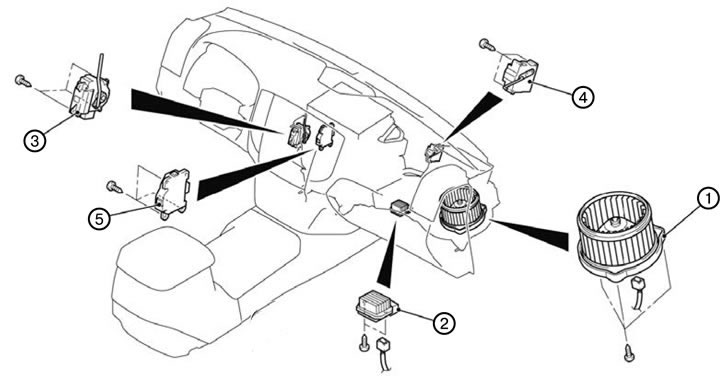 10. Снять мотор и потенциометр управления заслонкой смешивания воздуха (5).