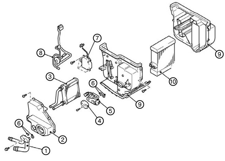 7. Снять мотор и потенциометр управления заслонкой выбора режимов (7).