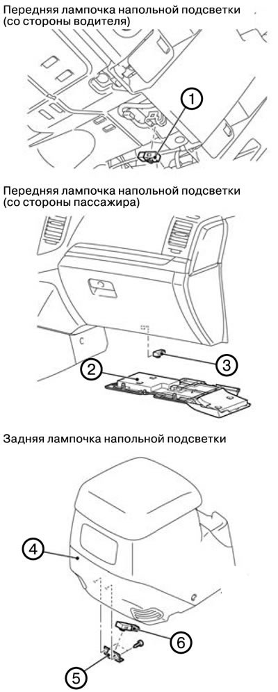 3. Снять переднюю лампочку напольной подсветки (со стороны пассажира) (3).