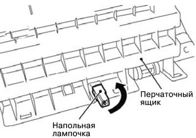 1) Провернуть переднюю лампочку напольной подсветки (со стороны пассажира) в направлении указанном на рисунке.