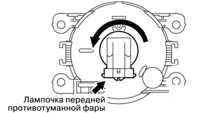 2. Отсоединить разъем, и провернуть лампочку передней противотуманной фары, чтобы снять ее.