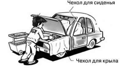 Прежде чем приступить к обслуживанию автомобиля, накрыть крылья, обивку и напольное покрытие специальными защитными чехлами. Следить за тем, чтобы ключи, застежки и кнопки не оставляли царапин на лакокрасочном покрытии.