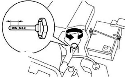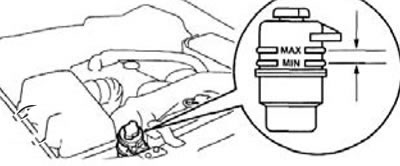 Отверните крышку бачка; уровень жидкости в нем должен находиться между отметками МАХ и MIN.