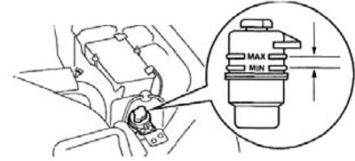 При работающем на холостом ходу двигателе проверьте уровень жидкости в бачке.