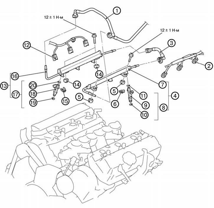 19. Установить топливный коллектор и форсунки в сборе (4).