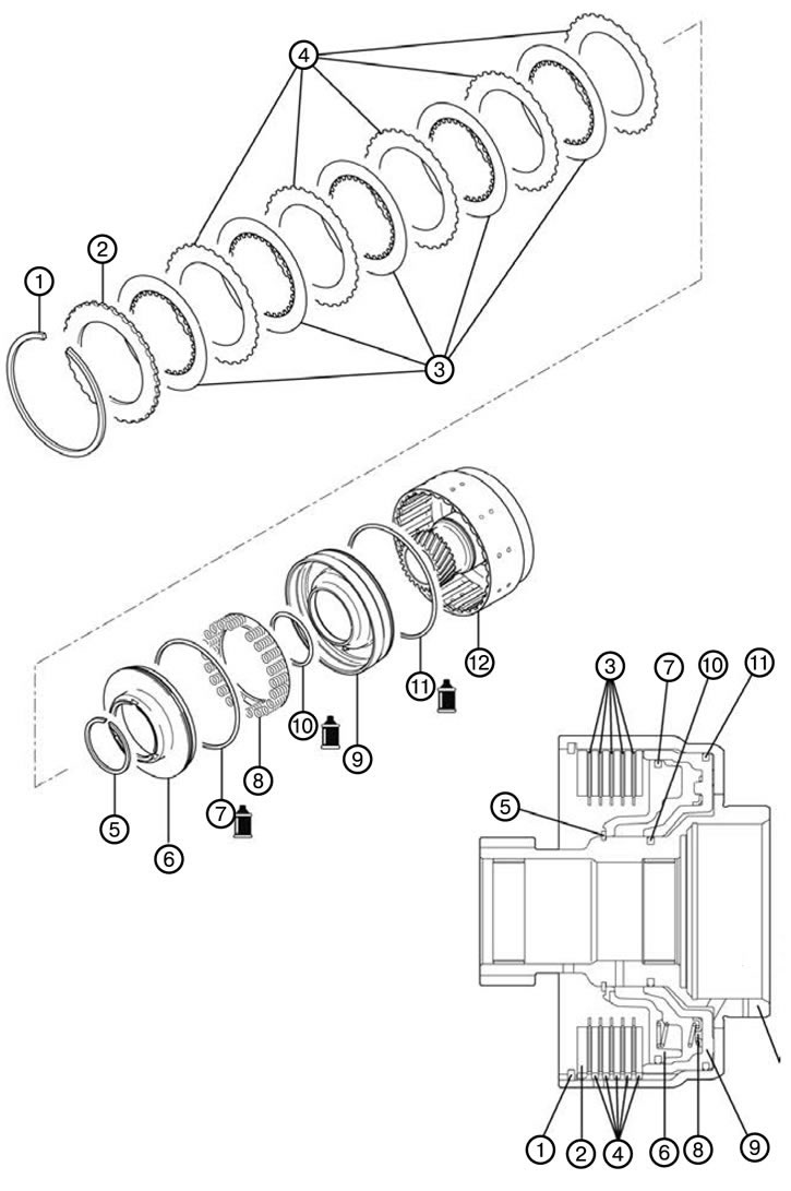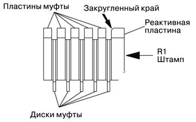 1) Поочередно установить пластины муфты и диски муфты в фиксатор муфты заднего хода.