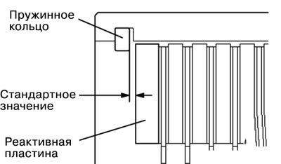 2) Нажать на заднюю часть реактивной пластины с силой 49 Н, и убедиться, что зазор между пружинным кольцом и реактивной пластиной соответствует стандартному значению. Если значение выходит за рамки стандартных значений, выбрать подходящее пружинное кольцо и отрегулировать зазор в соответствии со стандартным значением.