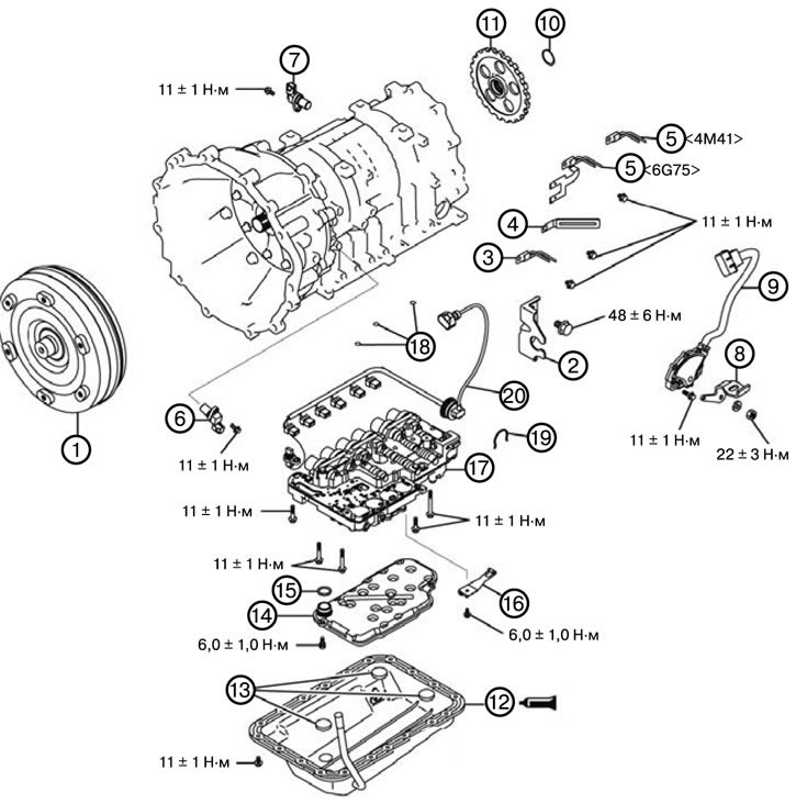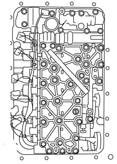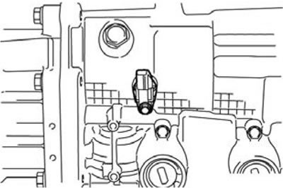 1) Вывернуть двадцать крепежных болтов и затем снять корпус клапана, три уплотнительных кольца и датчик температуры масла.
