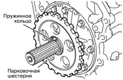 1) Снять пружинное кольцо, и снять парковочную шестерню при помощи съемника (сжимная сила примерно 9,8 Н).
