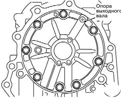 1) Вывернуть восемь крепежных болтов опоры выходного вала, и затем снять опору выходного вала и прокладку