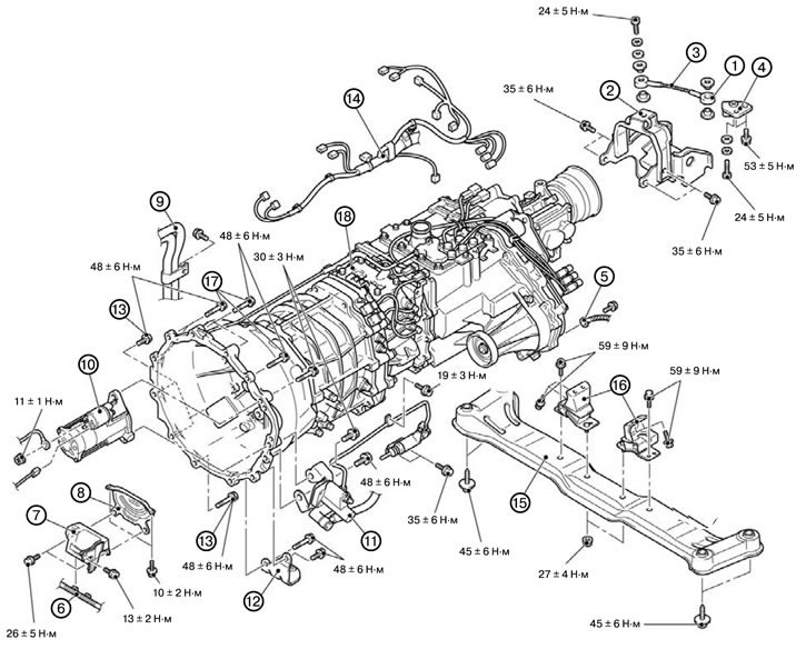 1) Опустить коробку передач, так чтобы появилась возможность для отсоединения разъемов электропроводки, и затем отсоединить разъемы.